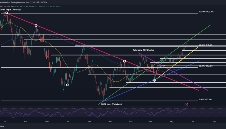 In the event of a pullback from current levels, initial support appears at 4,325/4,315, but further losses could be in store on a push below this area, with the next downside target at 4,260, followed by 4,200. On the flip side, if the S&P 500 defies expectations and manages to clear the ceiling at 4,385 decisively, bulls may become emboldened to launch an assault on 4,420 and 4,500 thereafter.