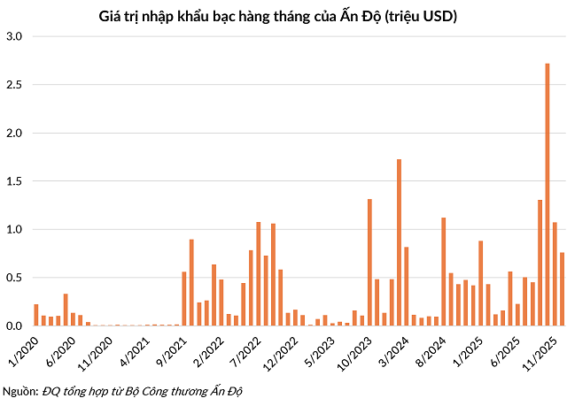 Tính riêng 4 tháng cuối năm 2025, kim ngạch nhập khẩu bạc lên tới 5.9 tỷ USD, vượt xa toàn bộ năm tài khóa trước đó. Đây là những con số biết nói, cho thấy nhu cầu tại Ấn Độ không chỉ là sự phục hồi sau đại dịch mà là một sự thay đổi về chất.