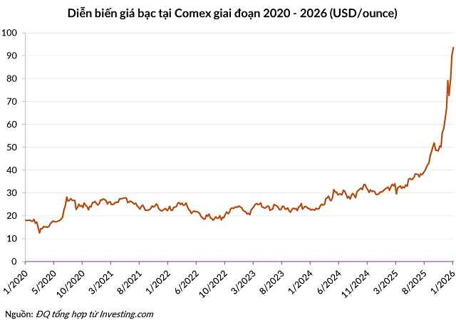 Trong khi giá bạc trên sàn Comex (New York) hay LBMA (London) vẫn được neo theo các hợp đồng phái sinh ở mức 94 USD/ounce, thì giá bạc vật chất tại Thượng Hải và Mumbai đã bứt phá lên một mặt bằng hoàn toàn khác, trên 100 USD/ounce. Có thời điểm, chênh lệch giá (premium) giữa Thượng Hải và London lên tới 11 USD/ounce (tương đương khoảng 10-12%).