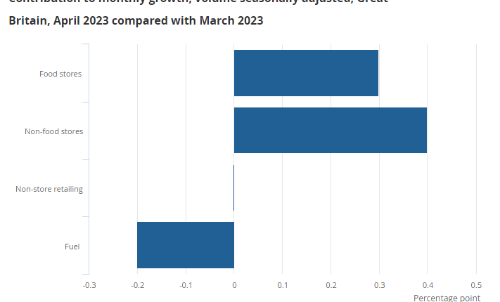 *NOTE: The graph above shows the contributions to the 0.5% month-on-month rise in overall retail sales volumes (quantity bought) in April 2023.