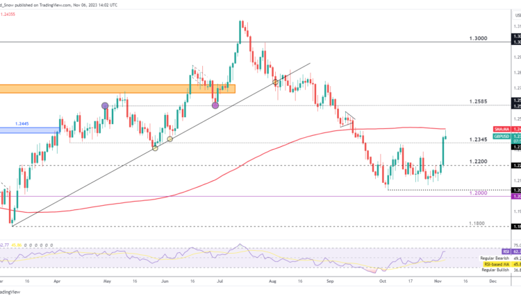 GBP/USD rose through prior support/resistance of 1.2200 and 1.2345 as the dollar and US yields turned sharply lower. Sterling has few bullish drivers apart from rate cut expectations where markets estimate the BoE will only consider rate cuts in Q3 of next year – outlasting estimates for the Fed which have recently crept into Q2 2024.