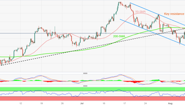 - Upbeat oscillators suggest limited downside room despite presence of three-week-old bearish channel.