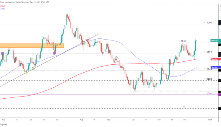 Ahead of the Fed and BoE meetings this week, GBP/USD (cable) eased into the 200-day simple moving average (SMA), testing the dynamic level of support before the sharp rise. The 200 SMA acted as a springboard for cable as prices look to close the week above the November seeing high of 1.2736.
