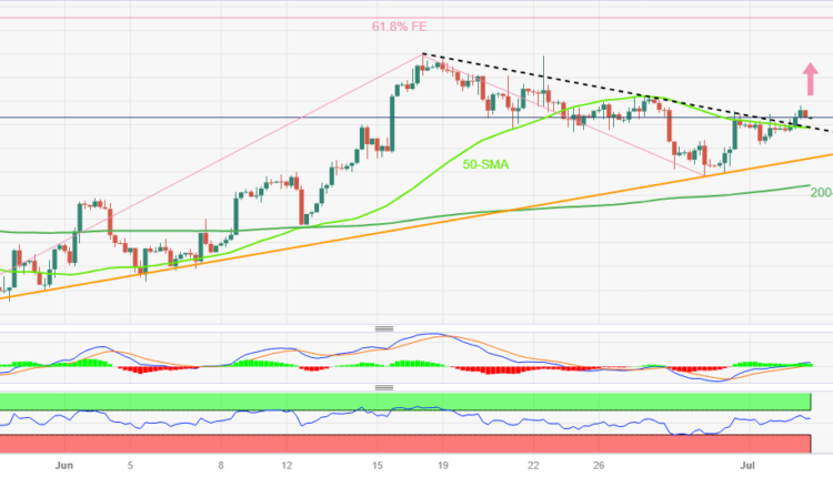 Despite the latest inaction, or say a lack of bullish action, the Cable pair remains on the buyer’s radar as it broke the key resistance confluence, now support, comprising the 50-SMA and a downward-sloping trend line from June 16, close to 1.2690.