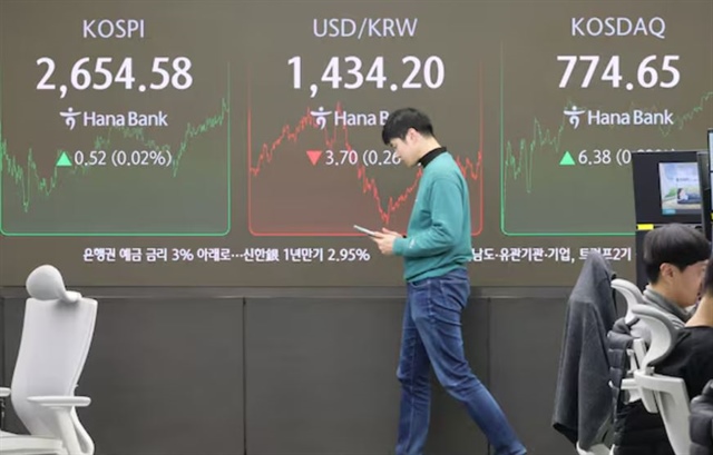 Bảng điện hiển thị điểm của chỉ số chứng khoán chuẩn Kospi ở phòng giao dịch của ngân hàng Hana Bank tại Seoul, Hàn Quốc hôm 21-2 Ảnh: Yonhap