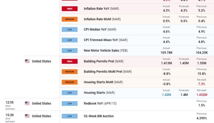 Canadian inflation (refer to economic calendar below) data showed signs of continued decline despite the marginal beat on MoM core inflation. I don’t believe this is enough to deter the current monetary policy stance from the Bank of Canada (BoC) in pausing their interest rate cycle at 15-year highs (4.5%). From a US perspective, building permit data suggests a further slump in the US housing market, adding pressure to the USD selloff today ahead of the US trading session. While the Fed is still likely to hike by 25bps in May, there accumulating data points in favor of a slowing economy possibly indicative of the Fed nearing its peak.