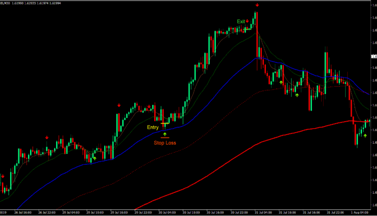 Price pullbacks can cause the sienna line to temporarily cross over the green line. However, the price action should respect the blue line as a dynamic support or resistance.