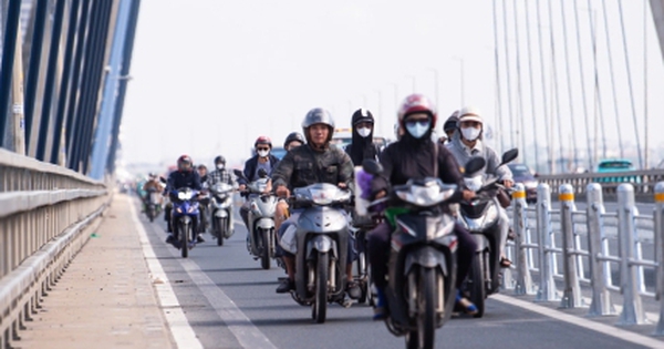 Xe máy lên cầu Nhật Tân được phân luồng bằng hàng rào sắt, buộc phải đi vào làn số 4, sát lan can cầu, thay vì di chuyển trên cả 4 làn như trước.