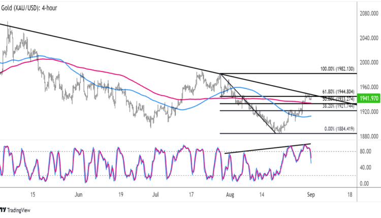 If the ceiling holds, watch out for a continuation of the downtrend back to the swing low at $1,885 or lower. After all, technical indicators are hinting that resistance is more likely to hold than to break.