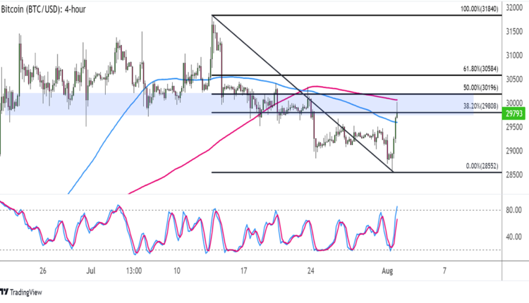 The Fibonacci retracement tool reveals that the former support area around the $30,000 major psychological mark is spanned by the 38.2% to 50% levels.