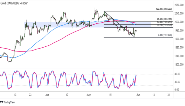 Turning lower could allow the resistance to hold, sending XAU/USD back down to the swing low at $1,927 or lower. Note that the double top spans $1,975 to around $2,050 so the resulting drop could be of the same height.