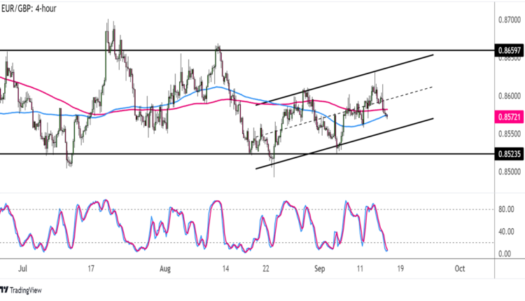 If any of these support levels hold, EUR/GBP could set its sights back on the top of the range, which might coincide with the ascending channel resistance.