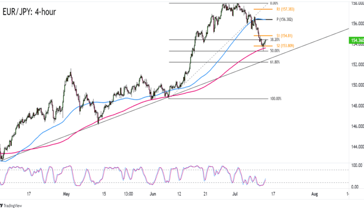 The pair is trading closer to 154.50, which is not far from the S2 (153.81) Pivot Point level in the 4-hour time frame.
