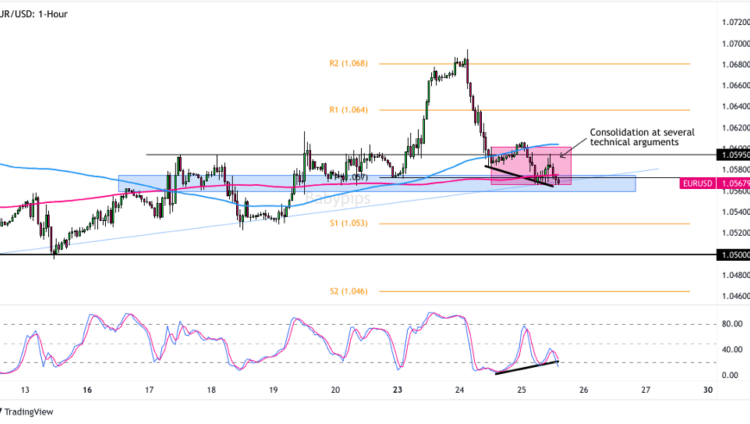 A momentum move lower could take the pair as low as the last major swing low area (roughly 1 daily ATR from current prices), which also happens to be around the 1.0500 major psychological level, before sellers run out of steam and/or fresh buyers jump in.
