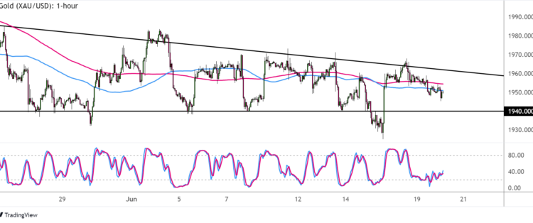 On its hourly time frame, XAU/USD is still stuck inside a descending triangle formation with its lower highs and support around $1,940.