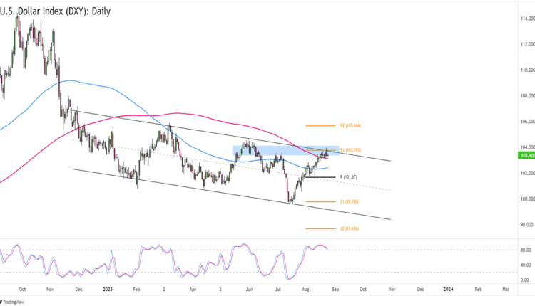 A long trade above the channel and the R1 resistance zone, for example, could work if there’s sustained buying pressure above the 104.00 previous high.