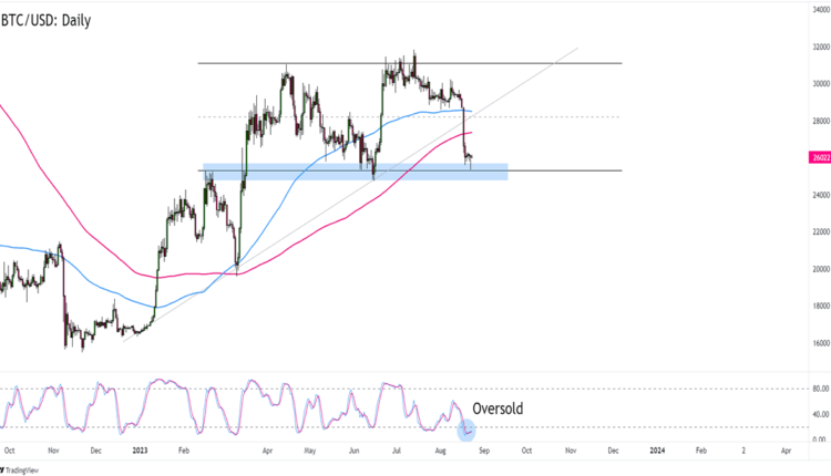 A bounce from BTC/USD’s current levels could bump the pair back up to the $28,000 mid-range zone that’s also near the broken trend line and SMA areas.