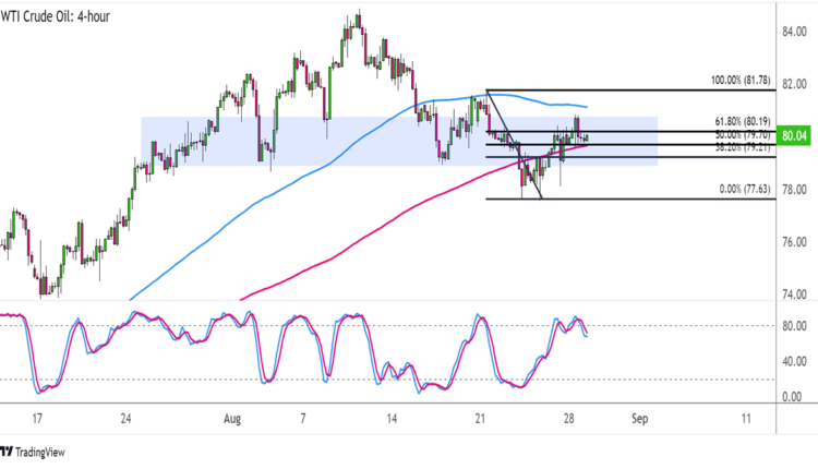 If that’s the case, the commodity could soon make its way back to the swing low near $78 per barrel or fall by the same height as the chart pattern.