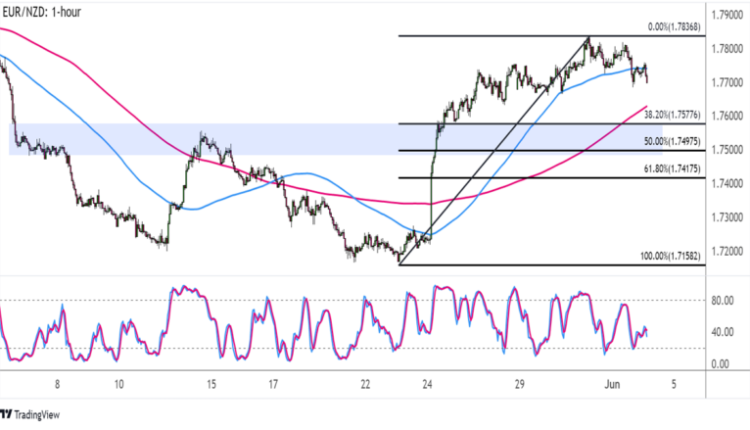 I’m looking at this sweet retracement setup on the hourly chart of EUR/NZD, as the Fibonacci tool highlights the areas of interest.