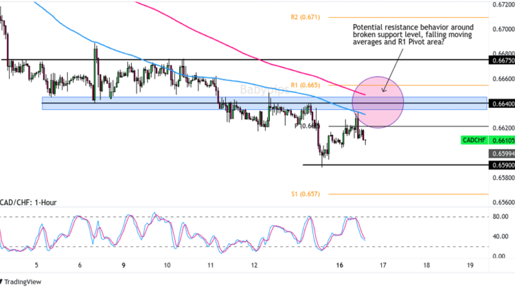 If volatility and Canadian events push the pair higher to the confluence of technical patterns (falling moving averages & broken support-turned-resistance area), then a strong setup to watch is bearish reversal patterns form there before considering a short position risk management plan.