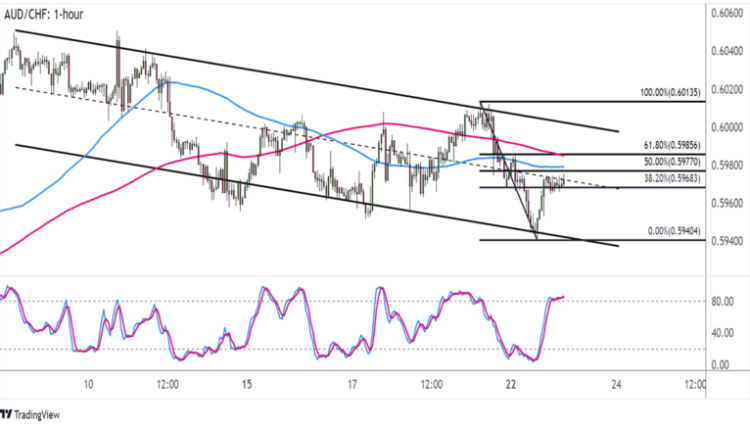 AUD/CHF is already testing the 38.2% Fibonacci retracement level that lines up with the mid-channel area of interest.