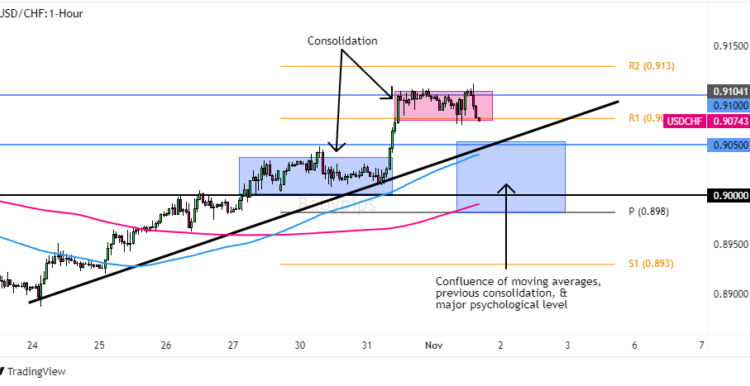 For the bears, a downside break (and potential retest) of the bottom of the consolidation range (around 0.9080) is a pattern to watch out for and see if that draws in more sellers.