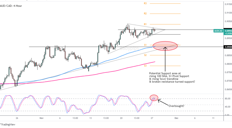 On the 4-hour chart above, we can see AUD/CAD has been in a uptrend ever since the market broke above and drew in buyers at the 200 SMA at the end of October. It’s been a pretty steady rise higher, but over the past week the market has consolidate into a range between 0.8950 to roughly 0.9000.
