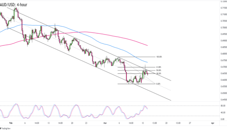 Trend warriors have another chance to jump on the trend as AUD/USD retests the channel’s resistance. This time around, the pullback lines up with the 50% Fibonacci retracement of March’s downswing.