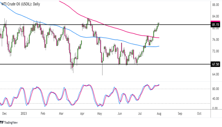 Crude oil has been on a tear lately, taking it to the top of its range visible on the daily time frame.