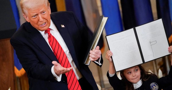 Sau khi ông Donald Trump ký xong, tất cả học sinh nhận bút dạ đen rồi ký tên lên tài liệu được phát sẵn. Kế tiếp, các em đồng loạt giơ cao những tờ giấy mình vừa ký tên.
