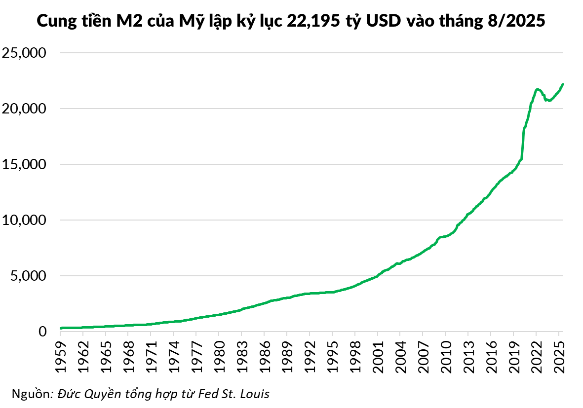 Đầu tiên, các gói cứu trợ khổng lồ trong đại dịch COVID-19 và các cuộc khủng hoảng sau đó đã khiến cung tiền M2 của Mỹ tăng vọt lên mức kỷ lục. Chính phủ và Fed đã chứng minh rằng mình sẵn sàng in ra hàng ngàn tỷ USD để cứu nền kinh tế, bất chấp nguy cơ lạm phát.