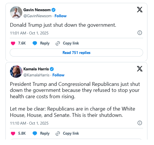 Cựu Phó Tổng thống Kamala Harris cũng lên tiếng: “Tổng thống Trump và Đảng Cộng hòa trong Quốc hội vừa đóng cửa Chính phủ vì họ từ chối ngăn chặn đà tăng của chi phí chăm sóc sức khỏe của người dân. Tôi muốn nói rõ: Đảng Cộng hòa đang kiểm soát Nhà Trắng, Hạ viện và Thượng viện. Việc đóng cửa là do họ”.