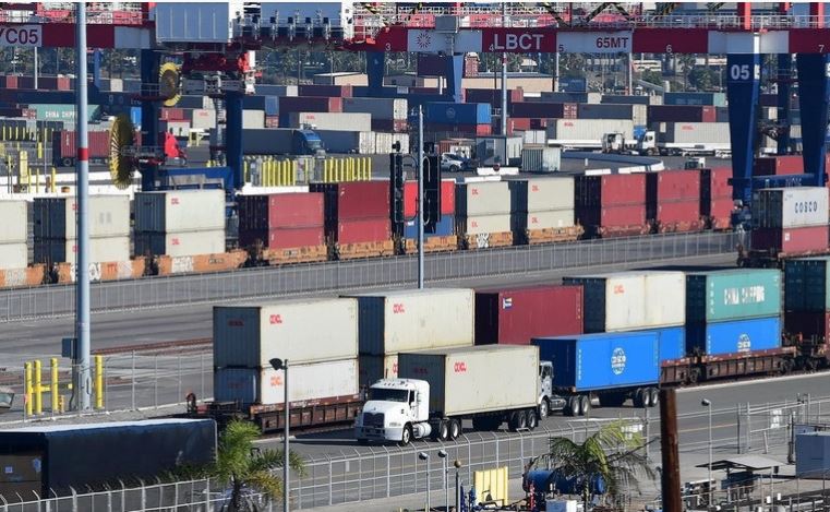 Container hàng hóa được bốc dỡ tại cảng Long Beach ở California (Mỹ). (Nguồn: AFP/TTXVN)