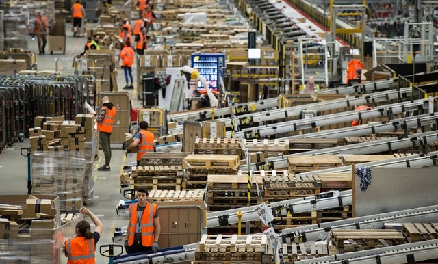 Nhân viên chuẩn bị hàng hóa theo đơn yêu cầu của khách hàng tại một trung tâm phân phối hàng của Amazon. (Ảnh: AFP/TTXVN)