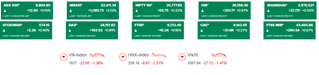 Kết phiên ngày 03/11, các thị trường chứng khoán châu Á-Thái Bình Dương đồng loạt tăng điểm trong phiên giao dịch đầu tuần, tiếp nối đà tăng từ Phố Wall khi cả ba chỉ số chính của Mỹ đều khép phiên cuối tuần trước trong sắc xanh. Tuy nhiên, thị trường Việt Nam lại đi ngược xu hướng chung của khu vực với cả hai sàn niêm yết chính đều chìm sâu trong sắc đỏ.