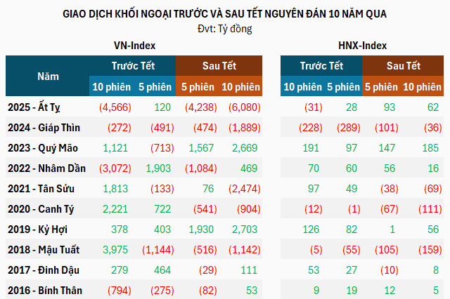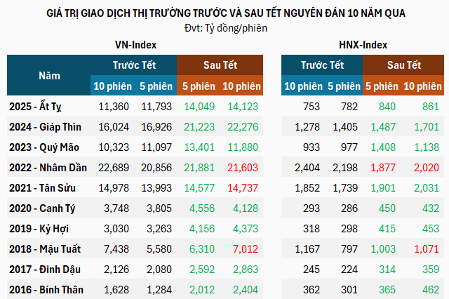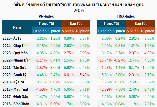 Theo dữ liệu từ VietstockFinance trong 10 năm gần nhất (2016 – 2025), VN-Index có đến 8 lần tăng điểm trong 5 phiên và 10 phiên sau Tết Nguyên đán, trừ hai năm là 2023 và đặc biệt năm 2020 với tác động của đại dịch COVID-19.