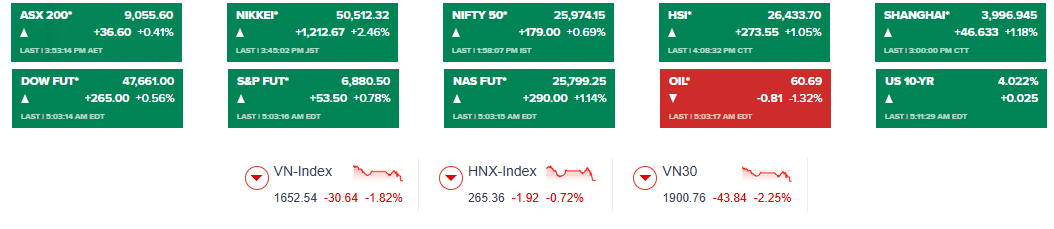 Thị trường châu Á dẫn đầu đà tăng, với chỉ số Nikkei 225 của Nhật Bản tăng 2.5% vượt ngưỡng 50,000 điểm lần đầu tiên. Kospi của Hàn Quốc tăng 2.9% lên mức cao kỷ lục. CSI 300 của Trung Quốc tăng 1.2%, và Hang Seng tại Hồng Kông tăng 1.1%. Trên Phố Wall, hợp đồng tương lai của S&P 500 và Nasdaq Composite lần lượt tăng 0.8% và 1.1%. Thị trường châu Âu cũng khởi đầu tích cực, với chỉ số Stoxx Europe 600 tăng 0.3% và Dax của Đức tăng 0.2%.