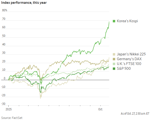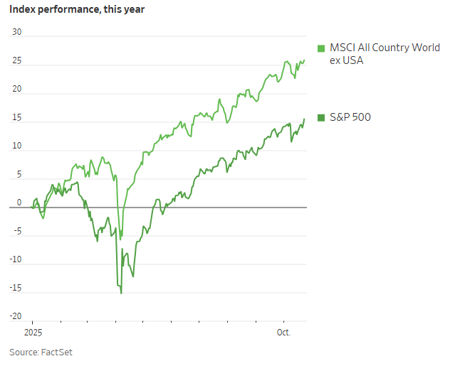 Chỉ số MSCI All Country World ex USA, theo dõi cổ phiếu các thị trường phát triển và mới nổi, đã tăng khoảng 26% trong năm 2025 tính theo đồng USD. Con số này vượt xa S&P 500 chỉ tăng 15% và đang hướng đến mức tăng trưởng hàng năm mạnh nhất kể từ năm 2022. Ngược lại, chỉ số Kospi của Hàn Quốc đã tăng 64%, DAX của Đức tăng 22%, Nikkei 225 của Nhật Bản tăng 24% và FTSE 100 của Vương quốc Anh tăng 18%.
