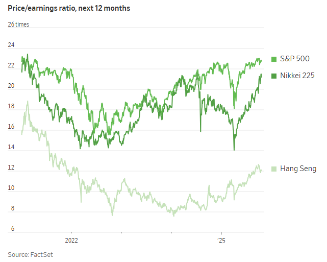 Các nhà phân tích cũng chỉ ra rằng cổ phiếu ở nước ngoài có định giá hấp dẫn hơn so với cổ phiếu Mỹ. Các công ty trong S&P 500 gần đây được giao dịch ở mức P/E 23 lần (dựa trên thu nhập dự kiến trong 12 tháng tới), theo FactSet. Trong khi đó, Nikkei 225 của Nhật Bản gần đây giao dịch ở mức 21 lần và hệ số P/E của Hang Seng Hồng Kông chỉ khoảng 12.