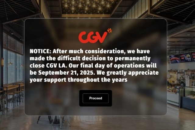 CJ CGV Co., nhà điều hành chuỗi rạp chiếu phim lớn nhất Hàn Quốc, đã đóng cửa rạp chiếu cuối cùng tại Los Angeles, Mỹ, chính thức chấm dứt 15 năm hoạt động tại Bắc Mỹ.