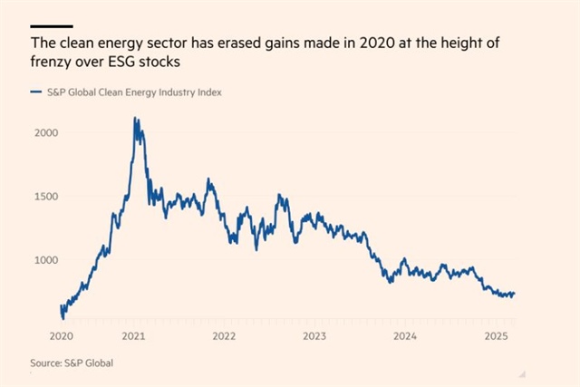 Chỉ số năng lượng sạch toàn cầu S&P đang ở mức điểm thấp nhất trong 5 năm qua. Ảnh: Financial Times