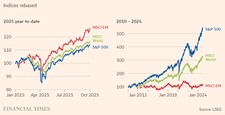 Một nhà quản lý quỹ cho biết sự hồi sinh của sự quan tâm đến thị trường mới nổi phản ánh “hoàng hôn của chủ nghĩa biệt lệ Mỹ, khi Mỹ đang hành xử ngày càng giống một thị trường mới nổi” thông qua việc hoạch định chính sách không ổn định và biến động.