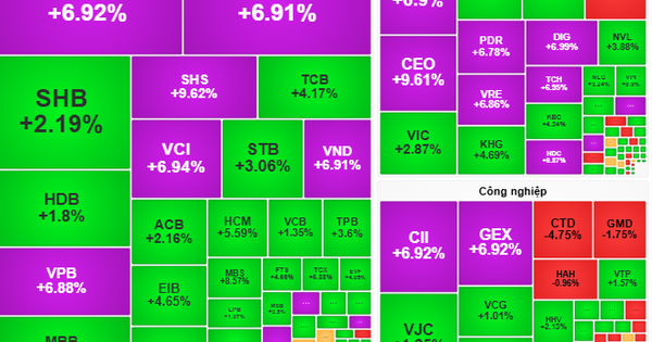 Kết phiên 4-1, nhiều cổ phiếu trên sàn HOSE tăng giá kịch trần 7% ( các mã cổ phiếu màu tím)