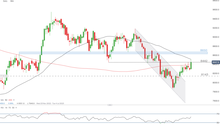The current retracement of the April decline picked up momentum after the news broke in the early hours of the morning but the bullish rise appears to be finding resistance at the 50 simple moving average – which corresponds to the high of the day – and the prior swing low at 8442, where prices reside at the time of writing.