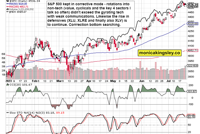 And stocks don‘t seem likely to move into a powerful, 10%+ downswing any time soon – consolidation and volatility triggered chiefly by rotations out of tech, and somewhat communications and only select discretionaries (remember my words about the relative strength of the consumer, which doesn‘t make for a bearish XLY case) into my best 2H 2023 sectoral picks of energy, industrials, materials and financials with further improvements in defensives incl. healthcare.