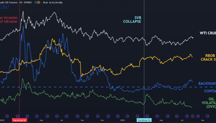 WTI CRUDE OIL, RBOB CRACK SPREAD, BACKWARDATION AND VOLATILITY (OVX)