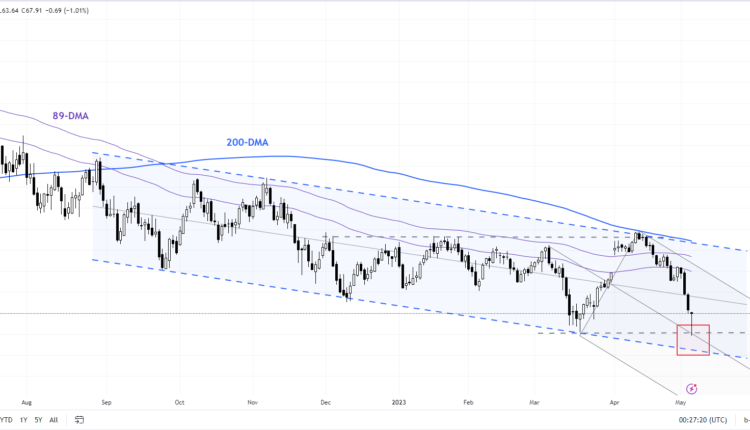 Crude oil extended its slide in Asia morning on continued worries regarding the demand for oil, rising real interest rates, and lingering banking sector concerns. However, on technical charts oil is testing vital support, raising the prospect of a pause in the slide or even a minor rebound.