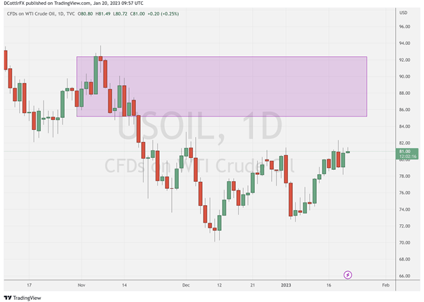 However, even if the market can consolidate above $82, the bulls will have plenty of work to do to erase the memory of the sharp falls seen at the end of 2022. They’ll be faced with a broad band of resistance which will come in between November 14’s close of $85.15 and the previous peak, November 4’s $92.28 closing high.