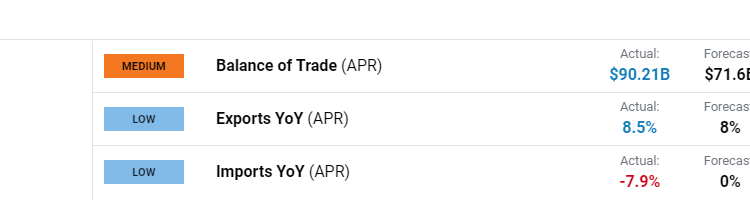 China’s trade balance came in much stronger than forecast at US$ 90.2 billion for April rather than the US$ 71.25 billion anticipated.