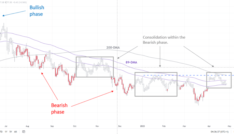 Note: In the above colour-coded chart, Blue candles represent a Bullish phase. Red candles represent a Bearish phase. Grey candles serve as Consolidation phases (within a Bullish or a Bearish phase), but sometimes they tend to form at the end of a trend. Note: Candle colors are not predictive – they merely state what the current trend is. Indeed, the candle color can change in the next bar. False patterns can occur around the 200-period moving average, or around a support/resistance and/or in sideways/choppy market. The author does not guarantee the accuracy of the information. Past performance is not indicative of future performance. Users of the information do so at their own risk.